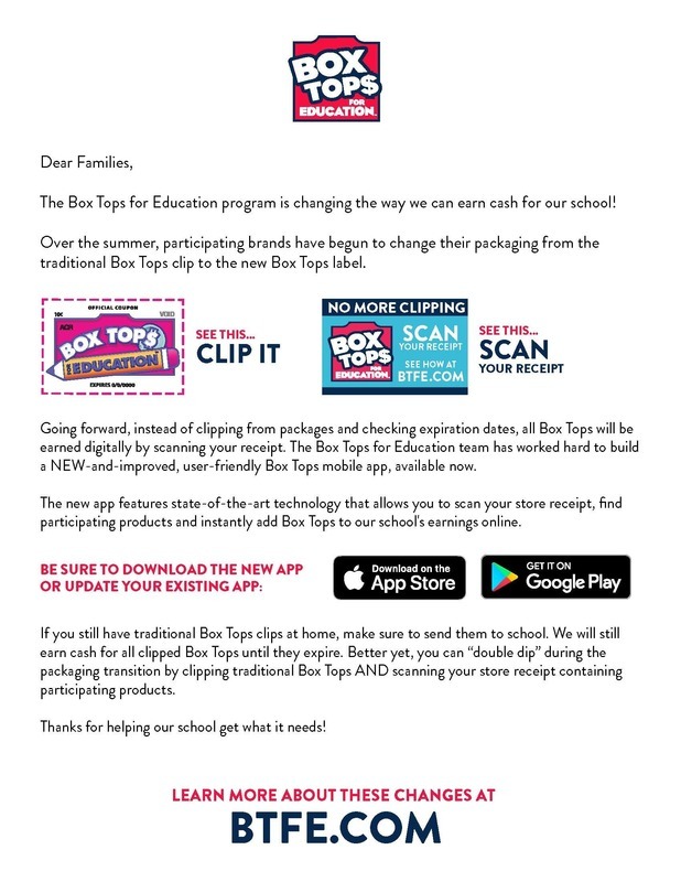 Box Tops: H-BC Elementary is again taking Box Tops for Education...NEW NEW Way of doing things. No more cutting box tops, until they run out. See the information on the next page. Download the Box Tops for Education App to scan receipts to credit H-BC Elementary School. Thank you for doing this. Here is the information...